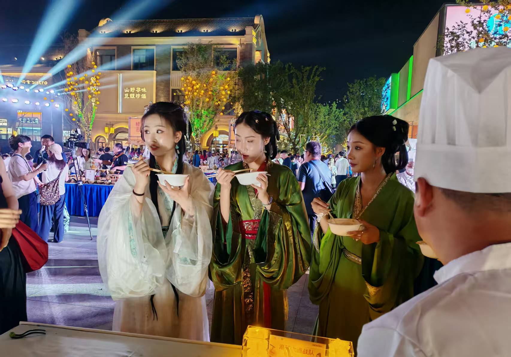 互动环节同样亮点纷呈。律动广场入口处,巨型楚王鼎形牛肉汤锅格外吸睛,工作人员现场熬煮牛肉汤,免费供市民品尝,让大家在热汤暖腹中感受“钟鸣鼎食·牛骨熬汤”的淮南饮食文化;淮望阁北侧广场,非遗传承人现场演示豆腐宴制作,菊花豆腐、白玉豆腐饺等经典菜品的制作过程,引得观众纷纷驻足拍照;现场还设置寿州窑出土碗仿品展示,让市民在品味美食之余,触摸淮南的历史脉络。
