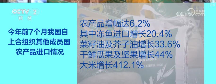 数据显示,2024年,我国从其他成员国进口农产品总值达136.6亿美元,自2001年以来年均增长13.3%。2025年前7个月,我国自上合组织其他成员国进口农产品增幅达6.2%。其中,冻鱼进口增长20.4%、菜籽油及芥子油增长33.6%、干鲜瓜果及坚果增长44%、大米增长412.1%。极大满足消费者多样化的饮食需求。